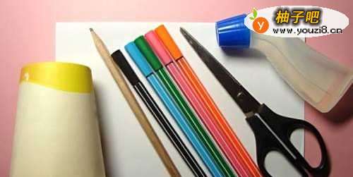 制作美丽的小公主的材料和工具,有一个纸杯、铅笔、 剪刀、卡纸、铅笔、彩色笔和胶水,如下图所示。