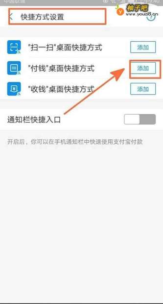 6接着,我们就会看到快捷方式设置页面,我们在付钱桌面快捷方式后边点击添加选项;
