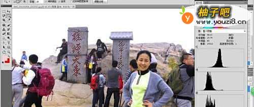 5有些图像中有石碑刻字之类的,如果你觉得他们的颜色不够鲜艳,你可以单独来调整,这里图片后面有两个石碑,所以先将图像放大(按住ALT键滚动鼠标中间滚轮)然后选择左侧工具栏中的魔术棒工具选择出石碑的字,然后选择图像---调整---色相/饱和度。调整到颜色鲜艳即可。这样一张旅行照片就调整完毕了。