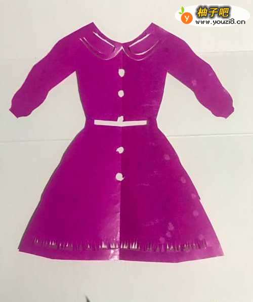 6第六步 剪完外围多余的彩纸之后 再剪里面的细节部分 镂空部分 还有前腿涂实的部分等等 全部剪完之后 打开压平 一件简单漂亮的秋季连衣裙就裁剪完成了