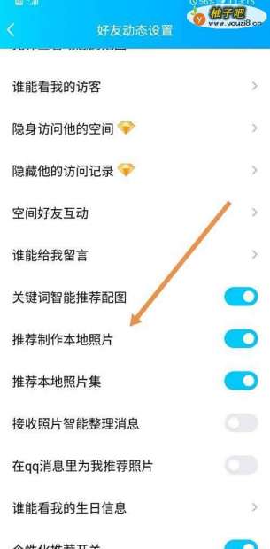 5点击互场打开好友动态权限设置,找到推荐制作本地照片并点击开启。