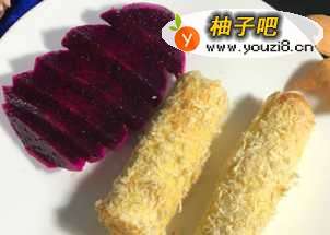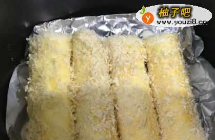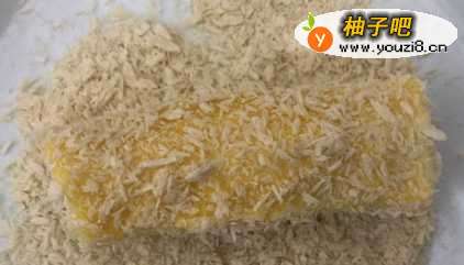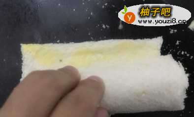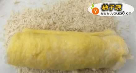 6将鸡蛋黄打散,卷好的吐司卷表面在鸡蛋液中打个滚,裹上面包糠