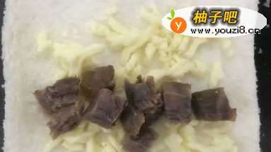 5慢慢的卷起来,重合处涂些蛋液,不容易散开