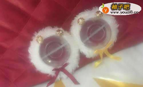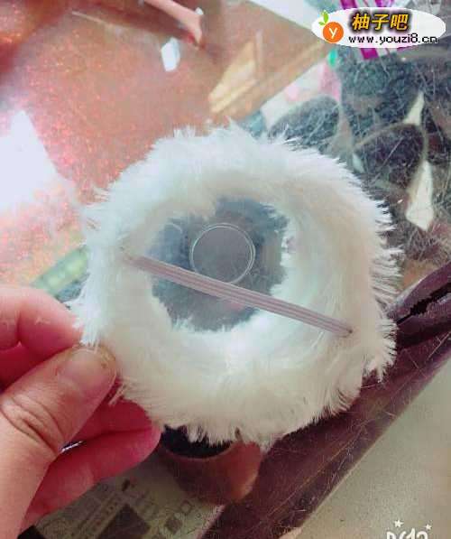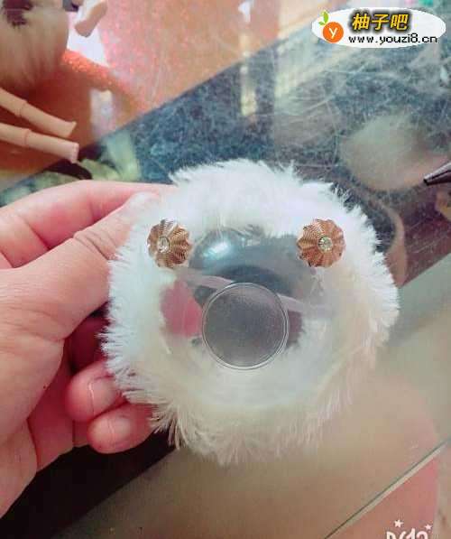 2前面粘上旧衣物或花边,我用的是旧衣物??用两个纽扣做眼睛