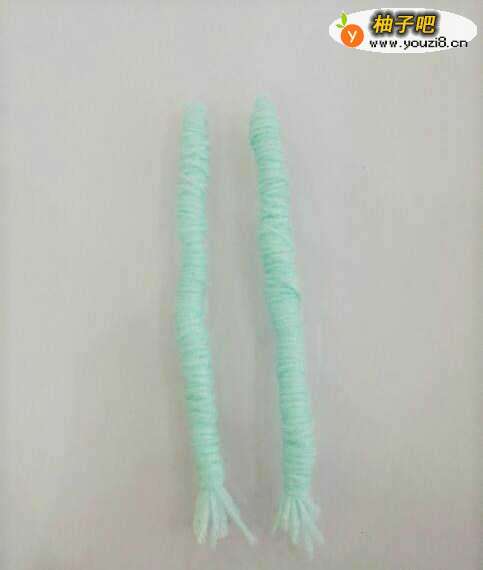10将缠好的这两根毛线小棍儿上半部分折弯,分别放在毛线球下面毛线束的两侧。