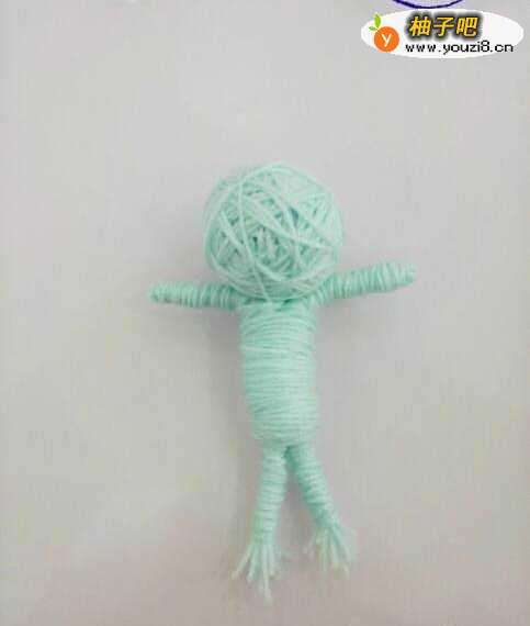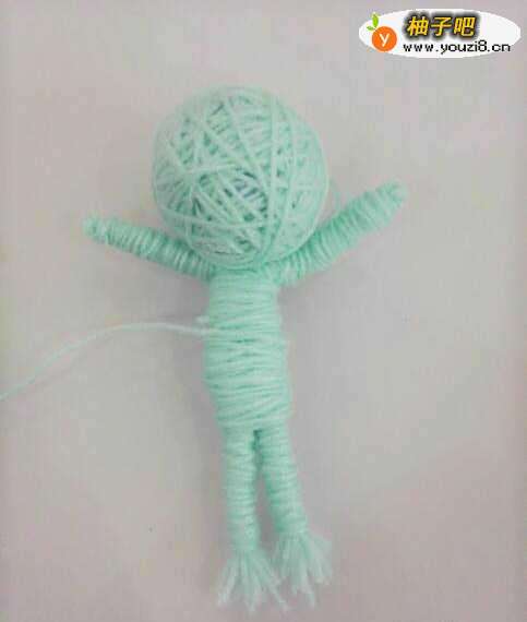 13继续缠绕,让身体部分看起来均匀一些,下面留出两条腿的位置。此时发现粗一些的毛线做这个娃娃更好些。