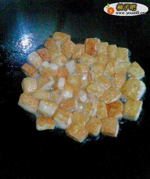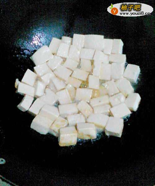 豆腐切块,热锅倒油(稍微放多一点点)