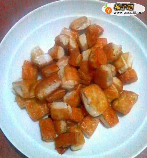 5关火一分钟冷却后铲起豆腐,留油在锅里。金黄金黄的煎豆腐就完成了