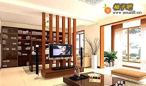 客厅跟书房原本有一面轻体墙,在本案在把这面墙已经拆掉,书房跟客厅一个空间。书房跟客厅中间一个装饰隔断,这样既能把客厅跟书房在视觉上分割开,又能做电视背景墙的装饰效果,软性的分割空间把两个空间相互利用,古色古香的书房衬托出客厅现代的家具,使这个厅显的更现代化了。