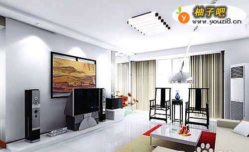 现代简洁中式风格,整个空间用以中式家具的深色为主色调,地砖及墙漆统一色调做为衬托,另整个空间简洁明快,简单的电视背景墙,现代时尚。