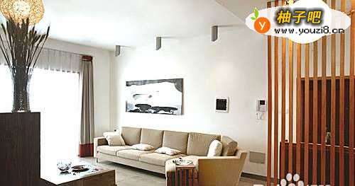 玄关:玄关处的处理,大胆采用木材代替屏风,使得客厅不致于一览无余。客厅的设计以追求简约为主题,墙上的装饰画作为点缀。