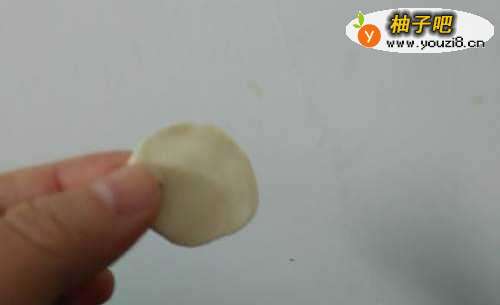 6再搓两个小白压季炼球,然后按成扁片,粘在眉毛下边,当眼睛。