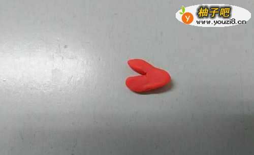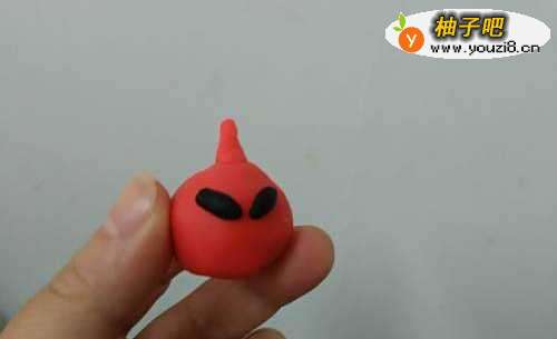 3再用一小块红色,捏成三角态鬼形,用剪刀剪开叉。