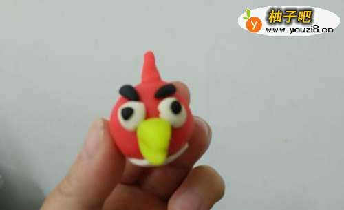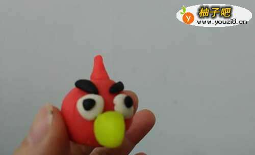 8用一块黄色捏成小三角,尖朝前,粘在眼下边,当作鸟嘴。