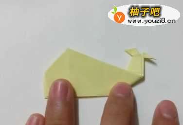 4把右边的三角形往里面翻折一下,然后折出两个小角出来,最后用笔画上鲨鱼的眼睛和嘴巴,一条凶猛的大鲨鱼就折好啦。