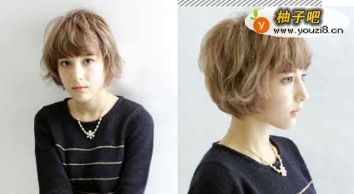 9很适合长脸女生的一款短发烫发发型,齐刘海的设计在视觉上缩短了脸型,搭配蓬松的烫发短发,清新利落,亚麻色的发色也很显肤白。
