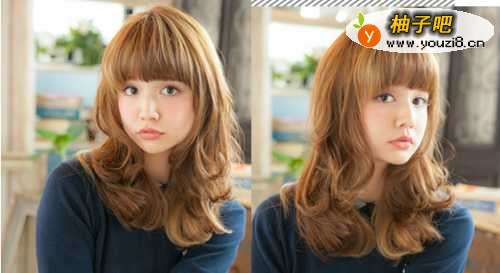 2胖脸女生不妨考虑这款发型,齐刘海的设计搭配两边的中长卷发,可以瞬间小脸呢,棕黄色的染发发色也显得时尚有个性。