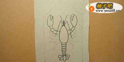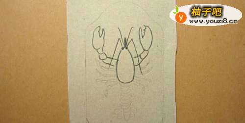 2接着,用铅笔画出可爱的小龙虾的草稿图,并用黑色水彩笔画出小龙虾的头部分出来,并画出小龙虾的钳子,如下图所示。