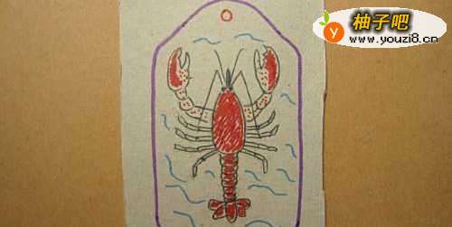 5然后,用红色彩色笔给小龙虾的身体上涂上颜色,并用紫色彩色笔把书签的外形轮廓线画出来,如下图所示。