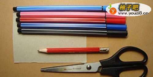 准备好制作可爱的小龙虾书签的工具和材料,有卡纸、彩色笔、铅笔、橡皮、直尺、剪刀,材料准备齐全,这样在制作时可以提高制作的速度,如下图所示。