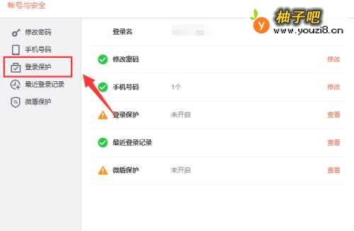 4进入账号安全界面,点击登陆保护选项进入,如下图所示