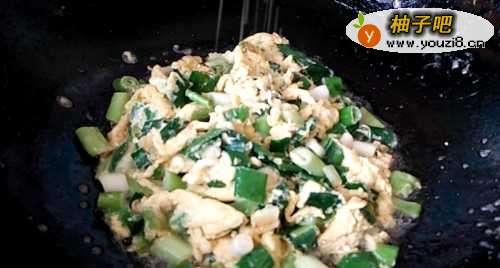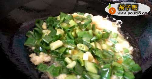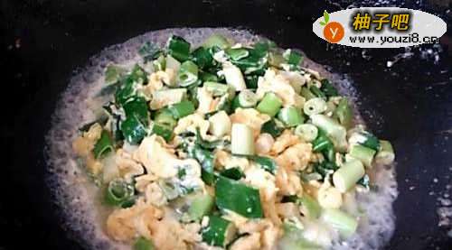 3锅中放油烧热,放入小葱和鸡蛋液翻炒。