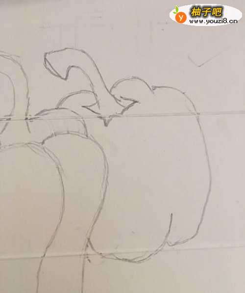 2第二步 再画一下这个大辣椒的形状 还有高低不平的纹路和分瓣 以及它的枝梗
