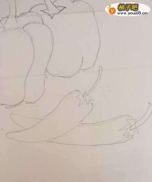 4第四步 再在两个大辣椒的下面 画上一个尖辣椒的轮廓
