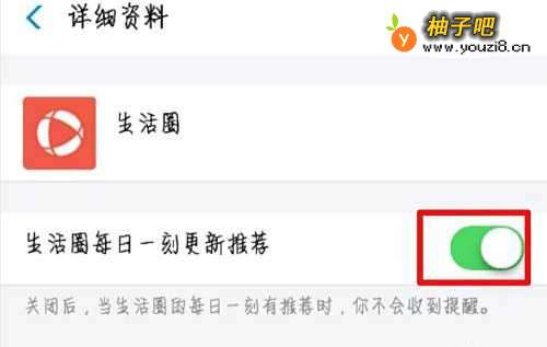 6在“详细资料”页面,我们将开启的“生活圈每日一刻更新推荐”右边的小功能按钮关闭了就可以了,之后更新都不会收到提醒了。