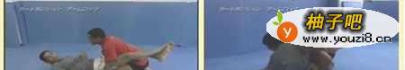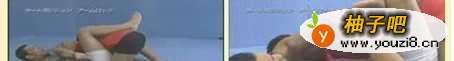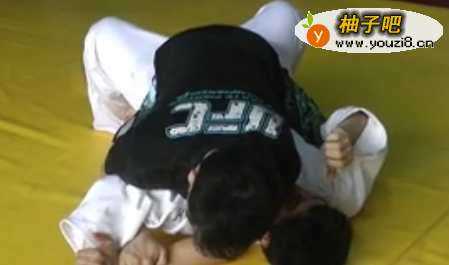 22.坐起瞬间将另一只手环抱穿过对手手臂,腋下夹紧对方后肩并扣住自己手腕。这时为了整个抓握动作更协调,打开全封闭防守的双腿来支撑身体平衡。