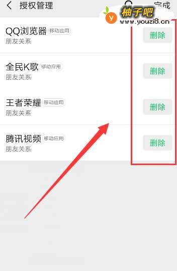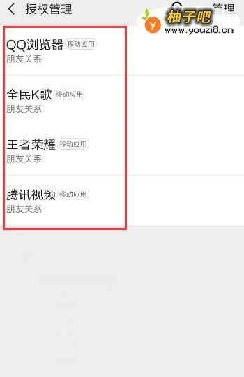 6来到授权管理页面,你要授权给谁,例如QQ浏览器,全民K歌,王者荣耀,腾讯视频,如图所示