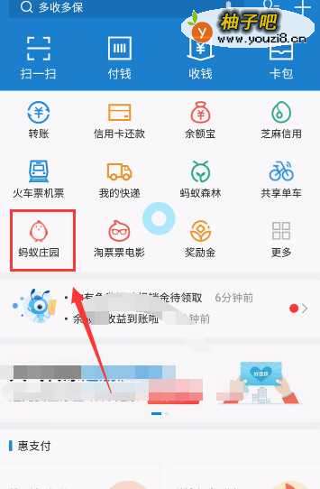 进入首页,点击蚂蚁庄园进入,如下图所示
