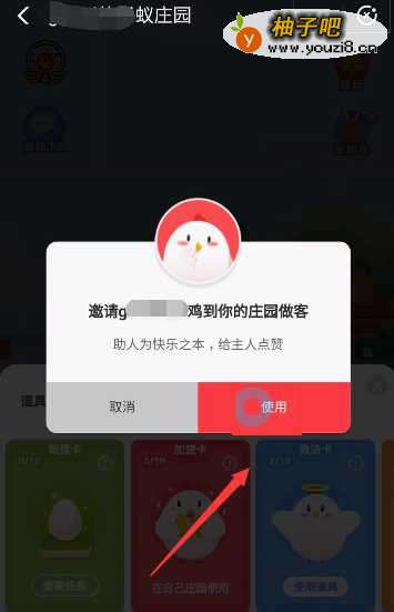 7道具使用成功,好友的小鸡就到你的庄园吃饲料了,如下图所示