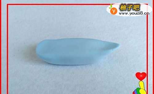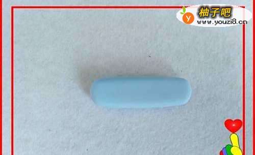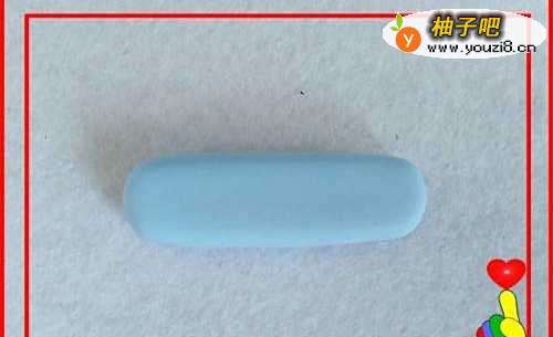 取天蓝色彩泥适量,滚搓成圆柱形,轻轻压扁。