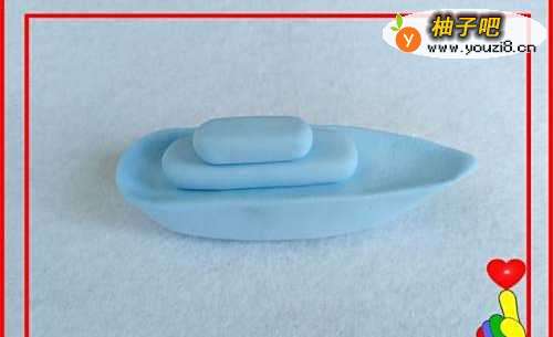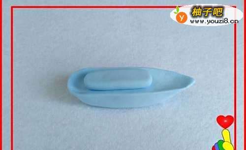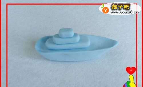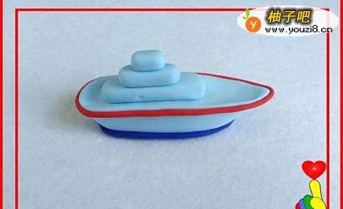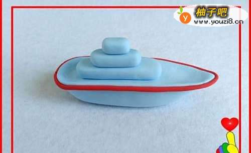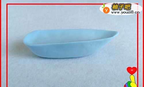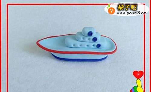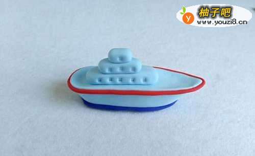 10取蓝色彩泥适量,滚搓成细长条,粘合于船底,作为装饰。