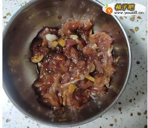 2、在肉丝上加入适量的生抽、老抽、姜和蒜后搅拌均匀备用。