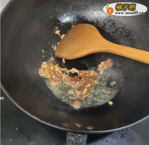 冷锅下油,待油七八分热的时候倒入腌制好的肉丝,进行翻炒,直到肉丝变色。