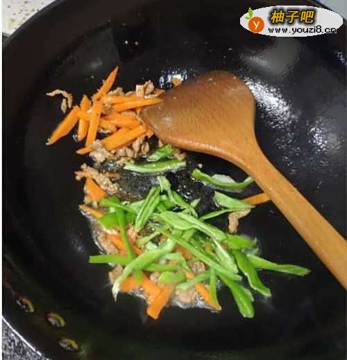 待锅里的胡萝卜变软之后,加入沥干的青椒丝,再继续翻炒均匀,直至青椒丝变软。