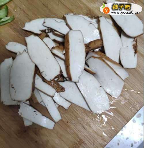 1、将香干切片,洗净沥干备用。