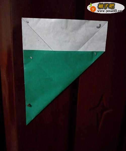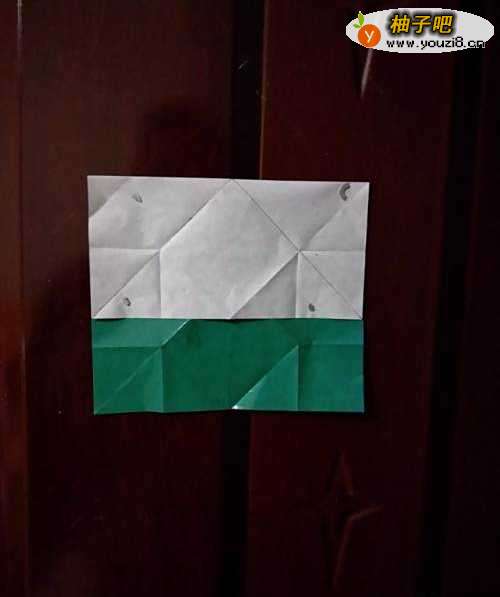 3将左边小正方形一半折如左边,右边小正方形一半折进右边。