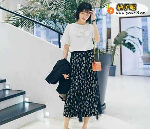 搭配二:红色小碎花裙子+黑色T恤黑色T恤是我们经常穿的,各种百搭,搭配一条红色小碎花裙子,低调又很显瘦。