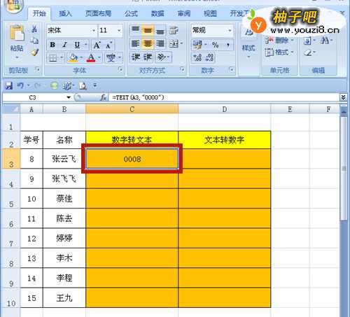 在C3单元格输入公式【=TEXT(A3,"0000")】。