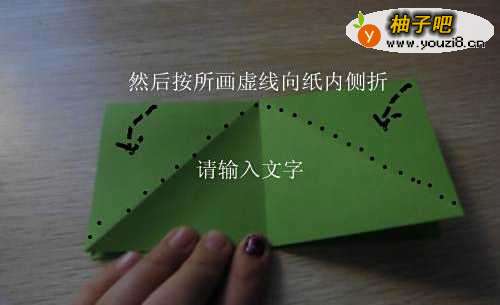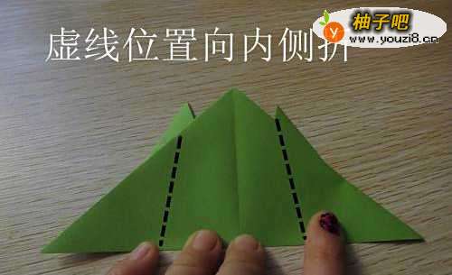 5步骤五:如图上虚线将画虚线部分向彩纸内侧折,折成图上所述形状,两边均按此方法操作。