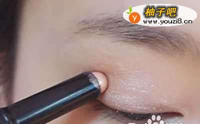 5眼头位置也要提亮,选择一款裸色的眼影棒涂在眼窝的2分之1接近3分之1的地方。