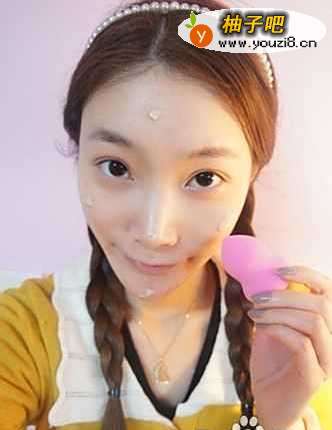 要想打造出韩式裸妆,当然要清透了,先将皮肤做好前期工作,再在脸上点上水润款的BB霜,用葫芦棉均匀的涂开。
