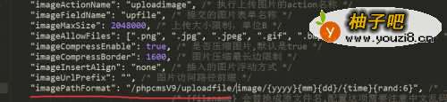 6修改ueditor/php/config.json,将/ueditor/php/upload/替换为/phpcmsV9/uploadfile/,注意该配置文件有多处需要修改的地方,请全部替换,下图之标记了一处。