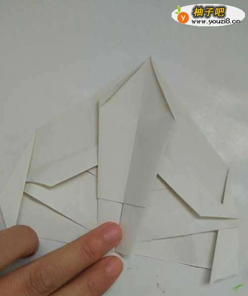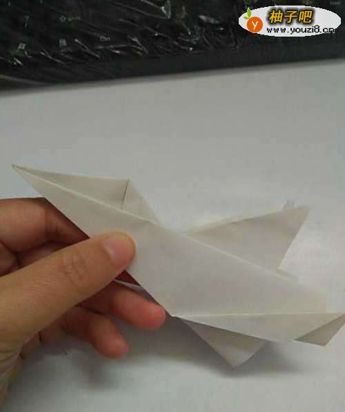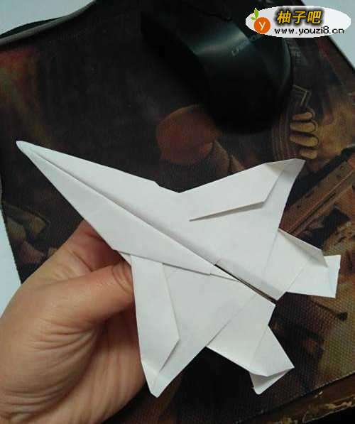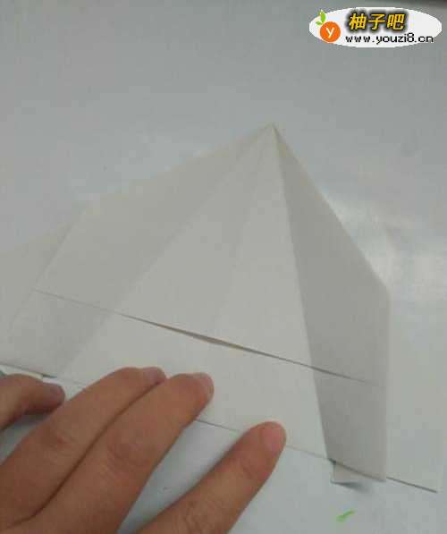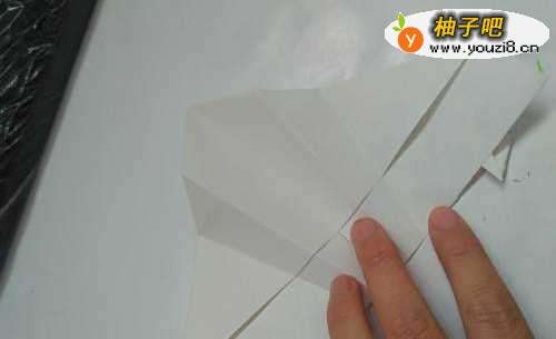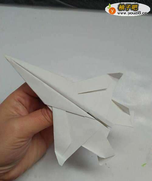 10把飞机的翅膀顺着折痕再向下折,另一侧同样操作。