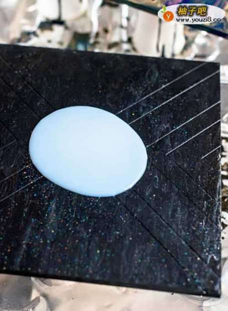 9从中间开始,倒一些黑色的,然后是白色的,然后是闪闪发光的和金色的,都在同一个水坑里。和以前一样,我把这件画倾斜了,直到我对它感到满意为止,我还把它保持在90度的角度,这样油漆就会在一个方向上滴落下来。把它放平,让它晾干。