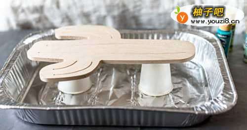 7然后把形状的正面放在杯子的顶部,紧紧地抓住它,把形状翻转到我的铝箔锅/道具上,直到我准备好,然后把装满油漆的杯子从形状上拿出来。