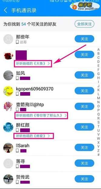 6这时候会看到一个列表,这个列表就是你的好友列表了,如果好友名称下面有图示的蓝色文字,就说明你的好友唱了这首歌,如果想听好友唱的歌曲的话,就点击这个蓝色的文字。